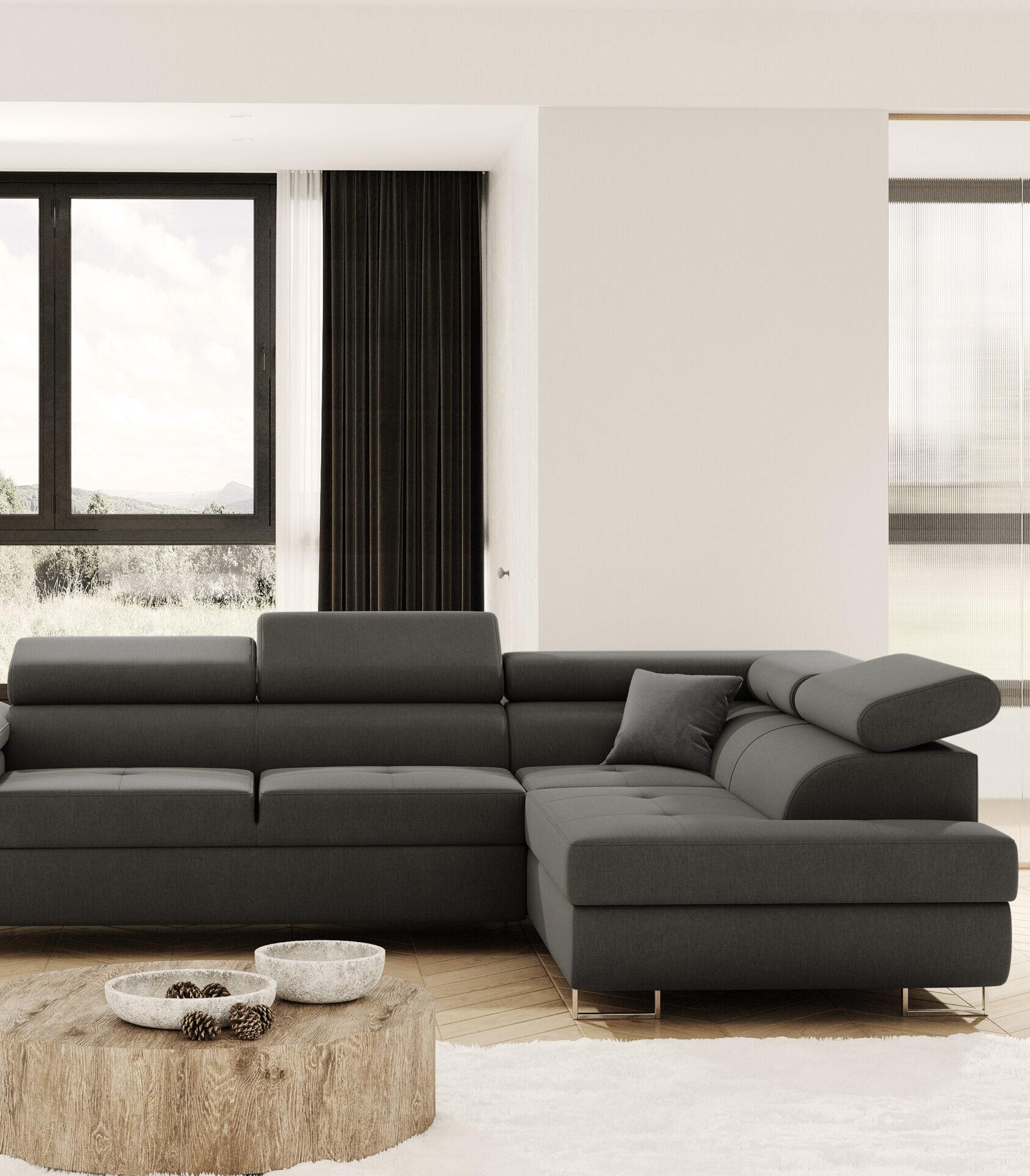 Narożnik „ATESIO” to kwintesencja stylu i funkcjonalności w jednym. Wykonany z najwyższej jakości materiałów, zapewnia nie tylko wygodę, ale również trwałość na lata. Dzięki swojemu przemyślanemu designowi doskonale wpasuje się w każde wnętrze, nadając mu nowoczesny i elegancki charakter. Przestronne siedzisko oraz ruchome zagłówki gwarantują komfort zarówno podczas codziennego relaksu, jak i spotkań z rodziną czy przyjaciółmi. Dodatkowo, narożnik „ATESIO” posiada funkcję rozkładania, co umożliwia szybkie przekształcenie go w wygodne miejsce do spania. Wybierz narożnik „ATESIO” i ciesz się luksusem oraz wygodą każdego dnia.