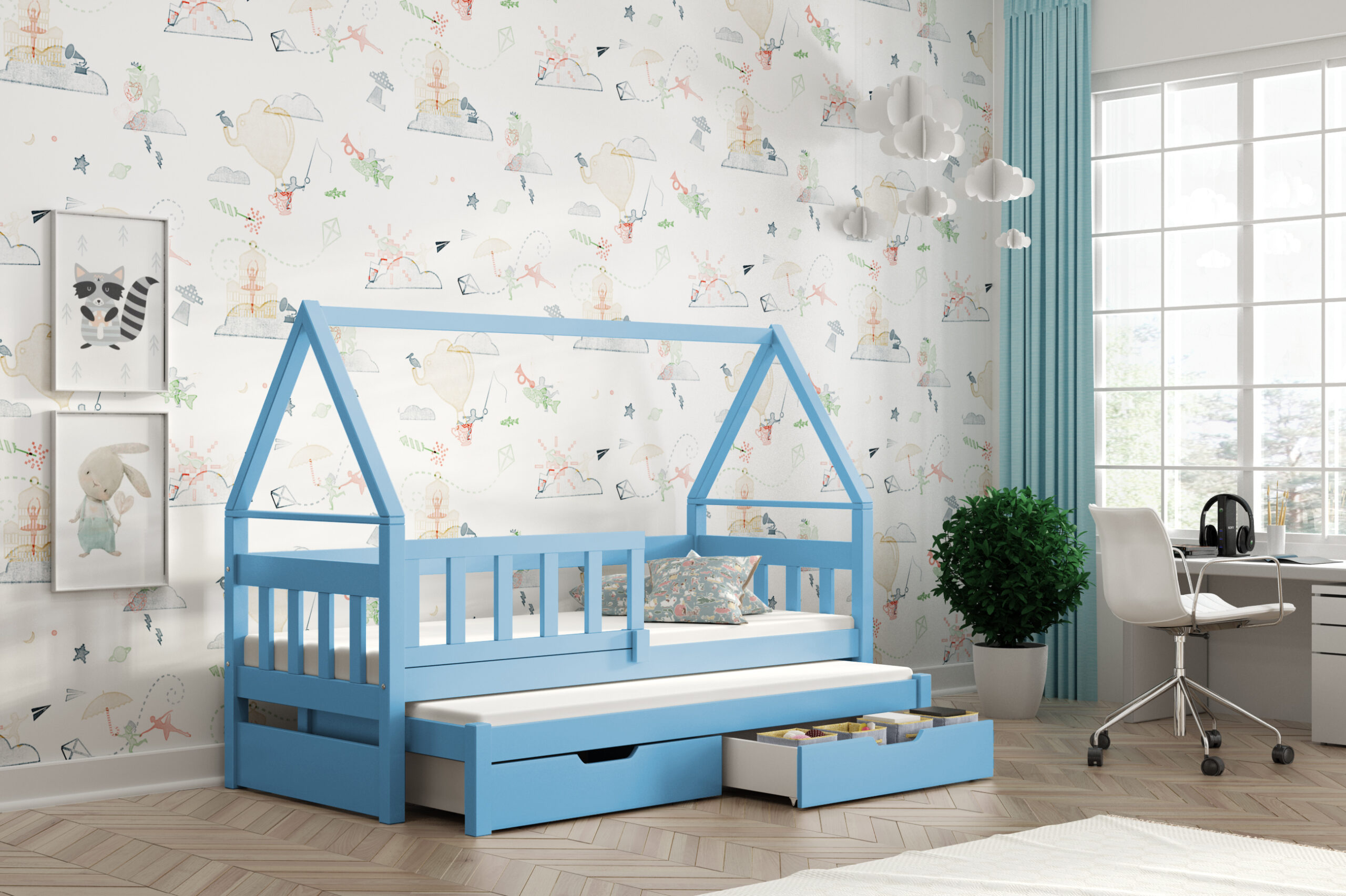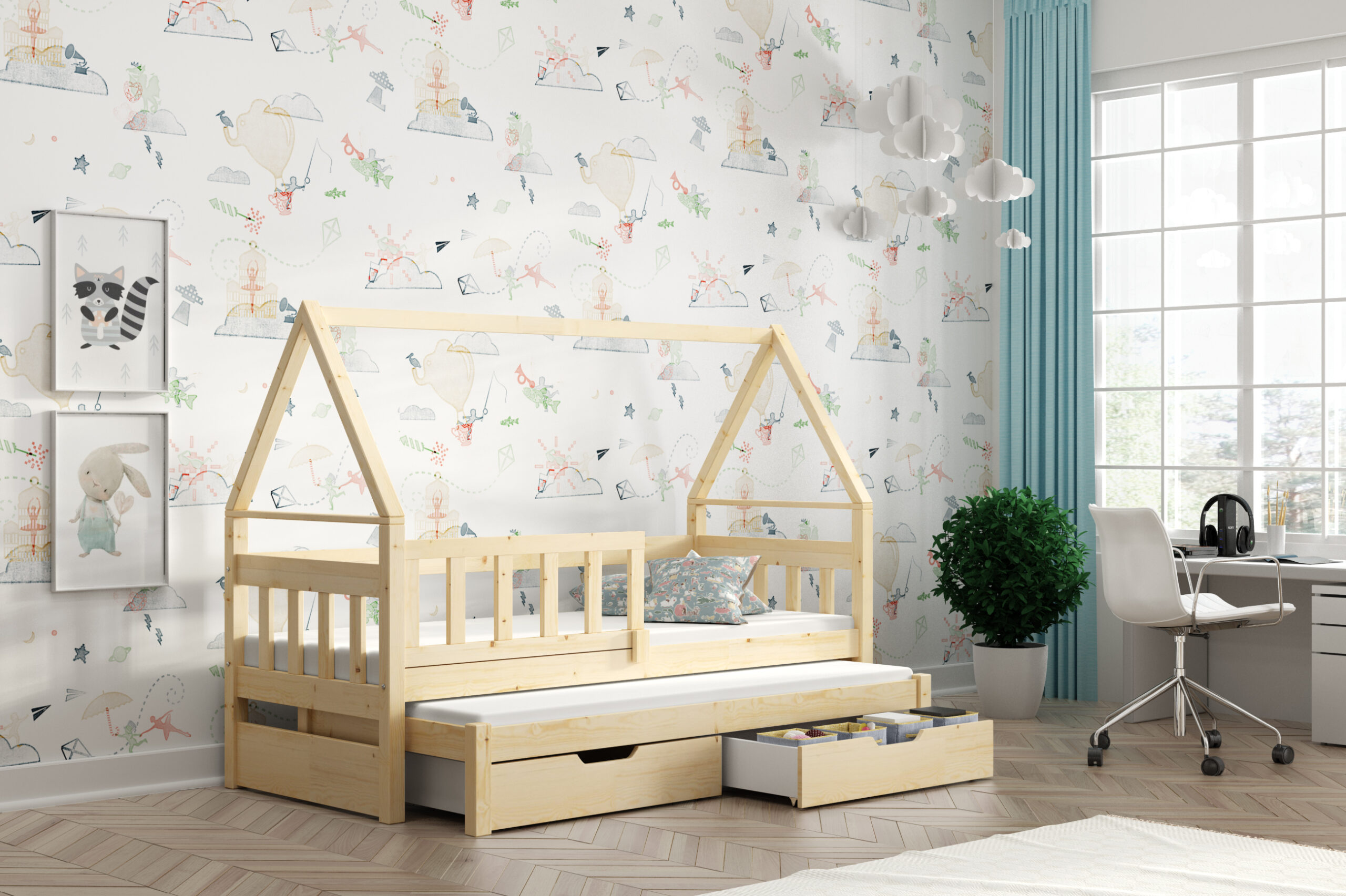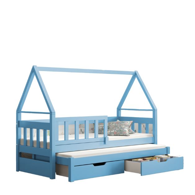 SKU: domek 3 os 2 Kategorie: Łóżka dziecięce, Podwójne łóżka dla dzieci, Podwójne łóżka dla dzieci z szufladami