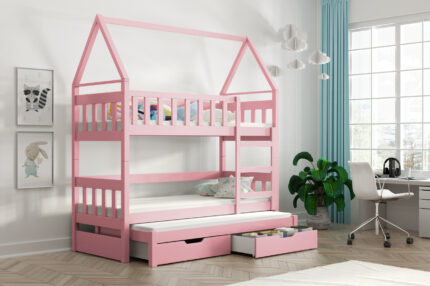 Łóżko piętrowe dla dzieci DOMEK 3 osobowe + materace