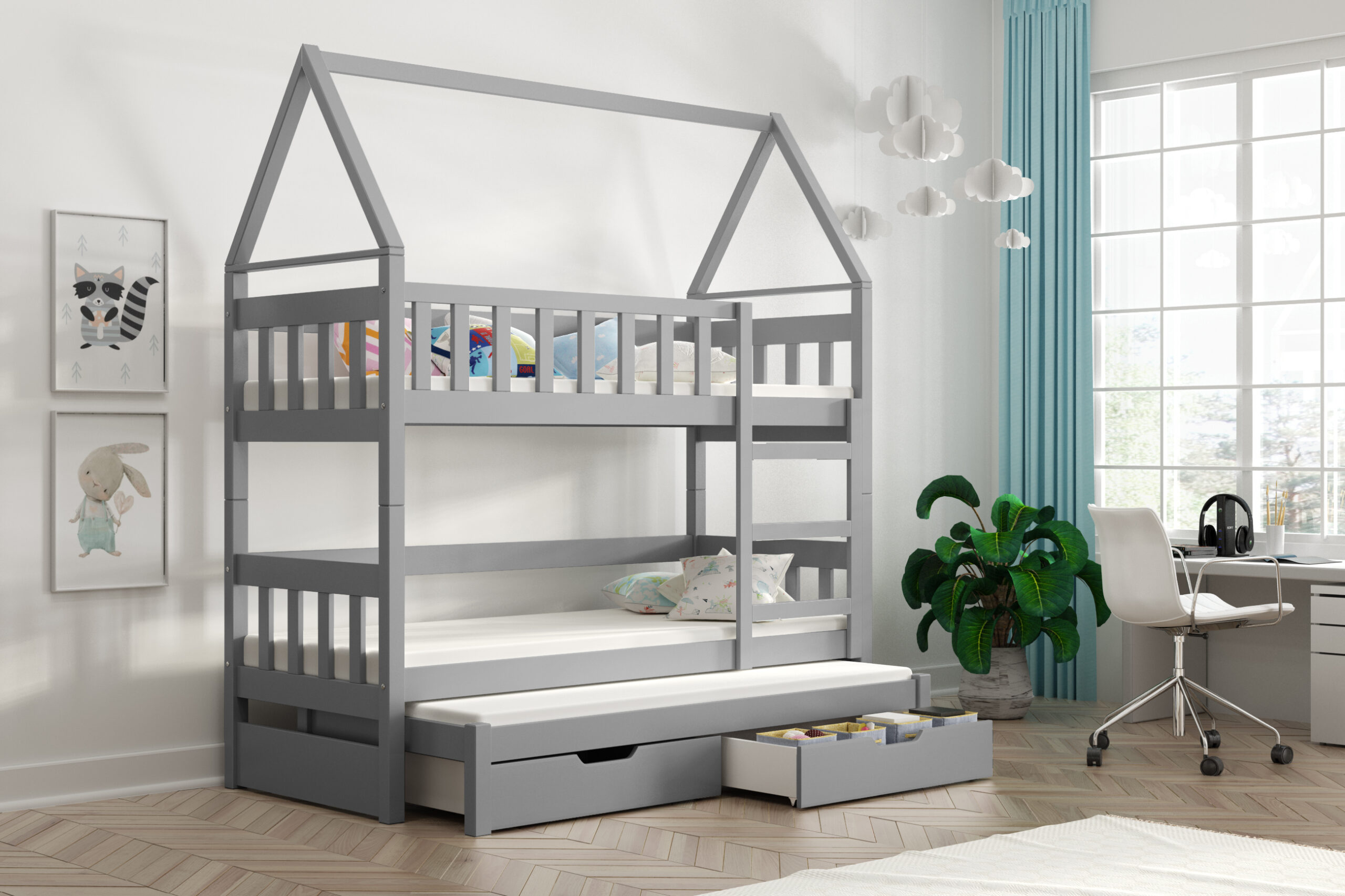 Łóżko piętrowe dla dzieci DOMEK 3 osobowe + materace