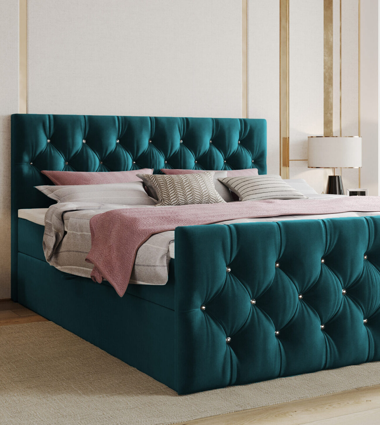 Łóżko pikowane kryształkami ciemnoszmaragdowy dwa pojemniki na pościel