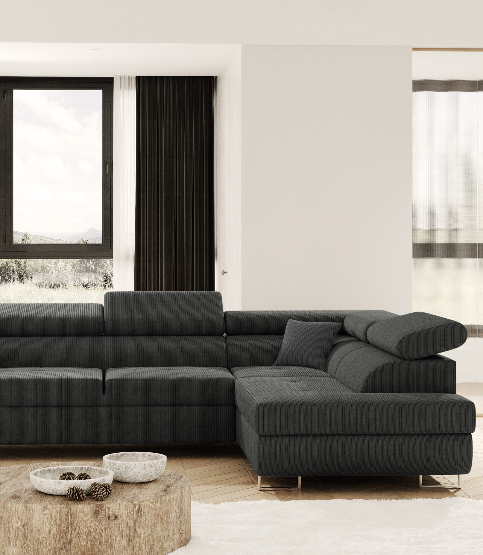 Strona główna Meble tapicerowane Narożniki Narożniki do salonu Narożniki do salonu z funkcją spania Narożnik ATESIO sztruks ciemny szary
