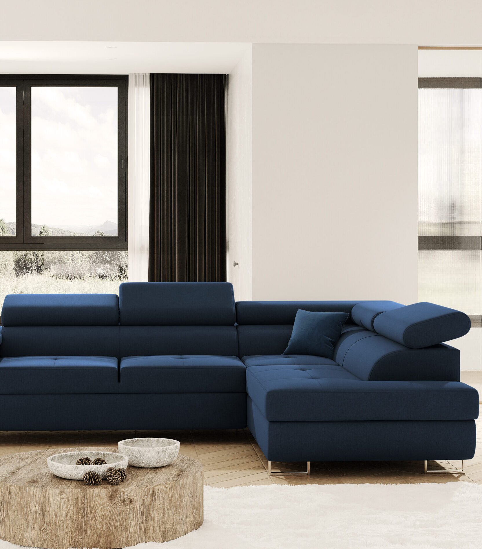 Strona główna Meble tapicerowane Narożniki Narożniki do salonu Duże narożniki do salonu Narożnik rozkładany ruchome zagłówki granatowy