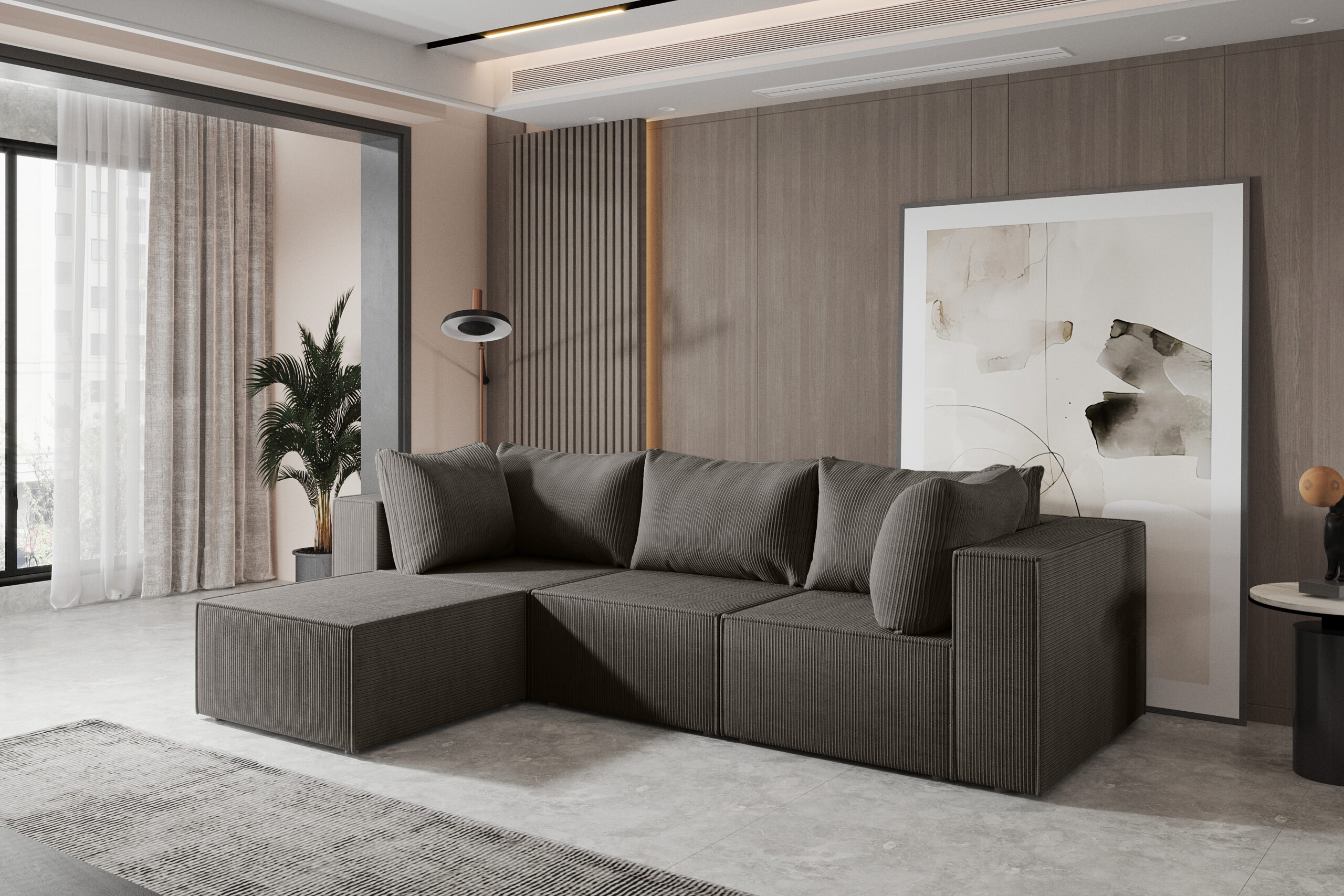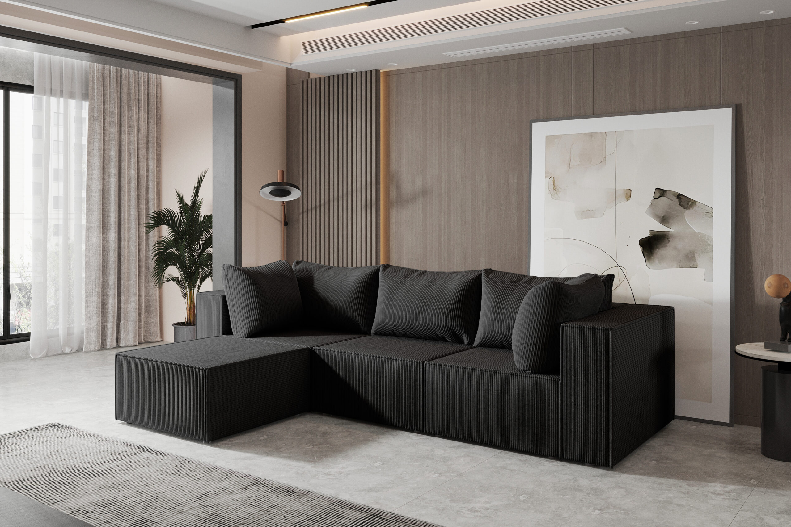 Narożnik HUGO z modularnym układem to doskonałe połączenie elegancji, komfortu i funkcjonalności, co sprawia , że jest idealnym wyborem do nowoczesnych przestrzeni w salonie