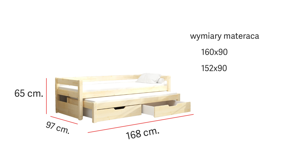 - korpus łóżka wykonany jest z wysokiej jakości litego drewna sosnowego, szuflady z wysokiej jakości płyty MDF